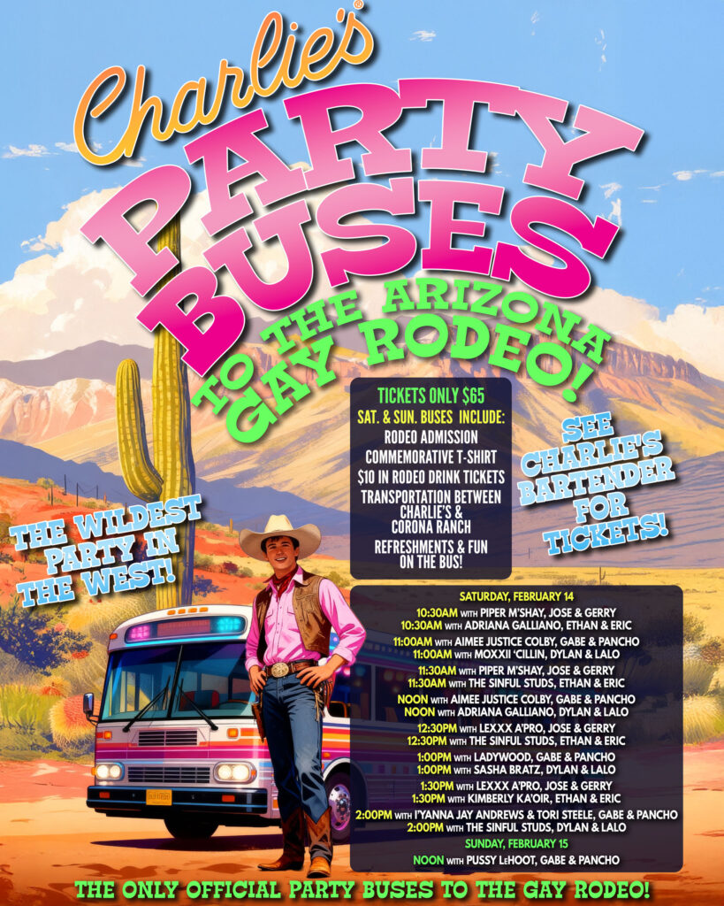 Party buses will run from Charlie’s Phoenix to the rodeo grounds and return to Charlie’s Saturday and Sunday on a pre-determined schedule. Tickets must be purchased in advance.